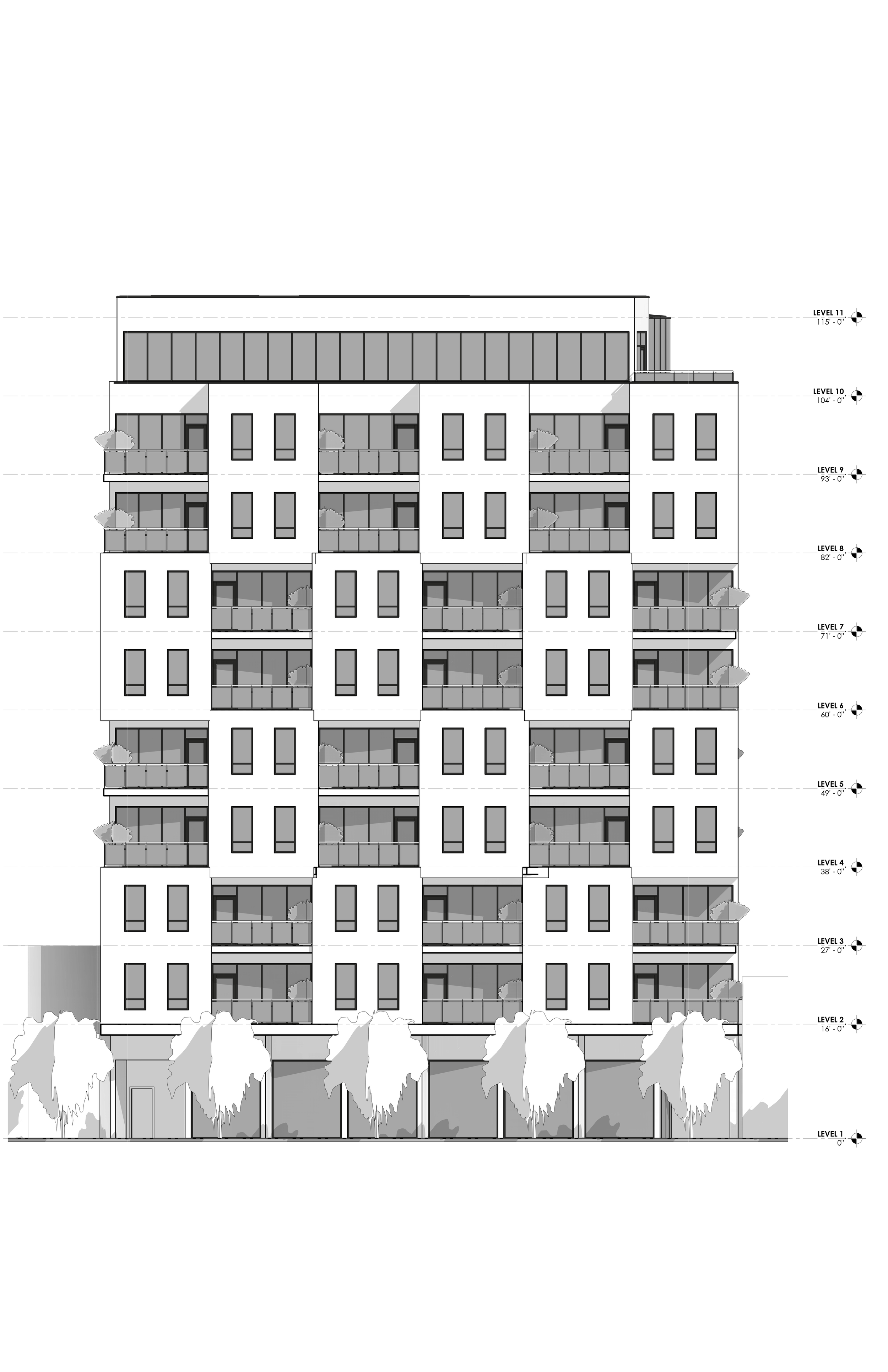 The structured parking will incorporate a semi-automatic parking system over 2 levels, at and above grade as well as in a below-grade pit. This system provides for 63 parking spaces for the various uses on site.